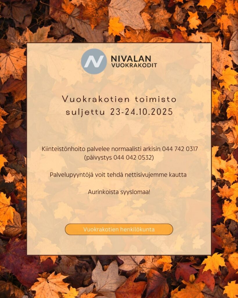 Vuokrakotien henkilöstö lomailee 5-20.7.2025. Asuntohakemuksia voitte laittaa normaalisti, käsittelemme niitä loman jälkeen. Lisäksi palvelupyyntöjä/asumiseen liittyviä toiveita voit lähettää normaalisti nettisivuiltamme. Kiireellisissä huoltotöissä voitte olla yhteydessä kiinteistönhoitoon soittamalla 044 742 0317 (arkisin) tai 044 042 0532 (päivystys) Toivotamme mukavaa kesää kaikille!